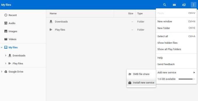 - To do this, open the Files app and select the three dots at the upper right of the window. Select Add new service and then select Install new service.