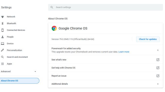 - Check for Chrome OS updates by going into Settings, selecting About Chrome OS, and to the right of your current Chrome OS version, selecting Check for updates.