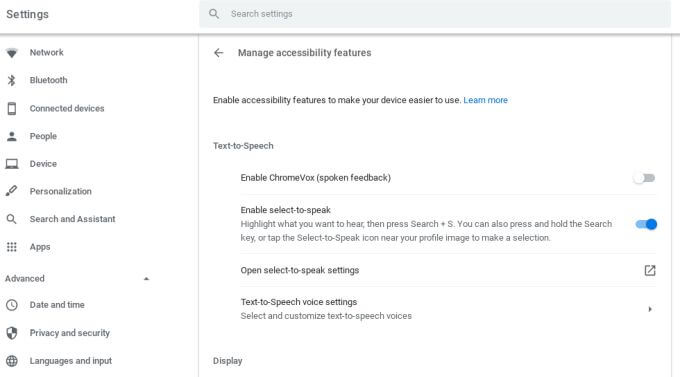 To use select-to-speech, highlight the text on the page that you want Chromebook to read to you and press **Search + s** on your keyboard.