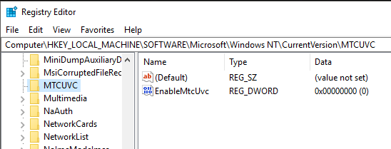 Create a new key under current version called *MTCUVC ***and then create a new DWORD value inside of MTCUVC called EnableMtcUvc. Leave it with a value of 0.