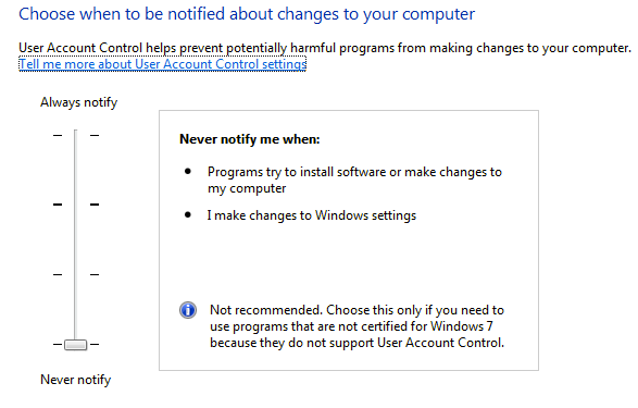 User Account Control is a different beast in Windows 10 and you can’t even fully disable it via the traditional GUI interface you see above. To actually turn it off, you have to go to the registry or edit the local security policy. However, there are a few unexpected consequences to disabling UAC in Windows 10, which you can read in full below.