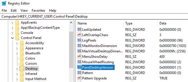Find PaintDesktopVersion under the Desktop key and change the value from 0 to 1. Next time you login, you’ll see the Windows 10 version number and build number as shown above.