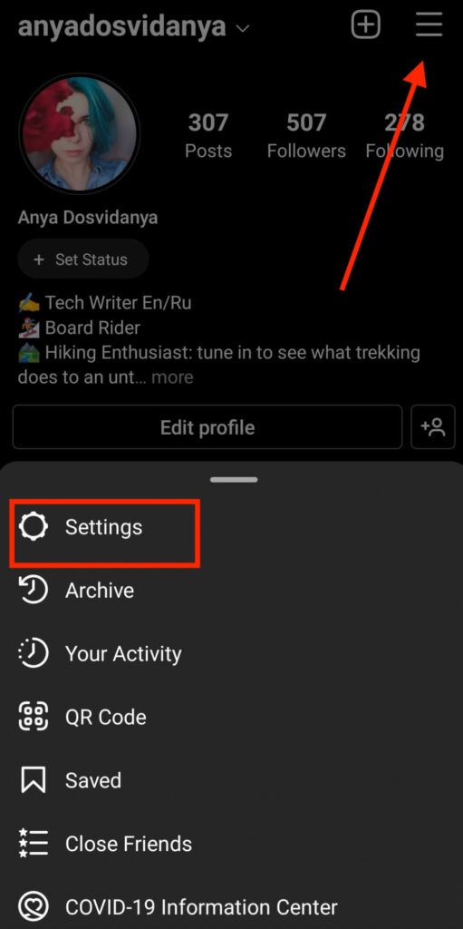- Open the Instagram app and go to your profile page. * Select **Menu** from the top right corner.