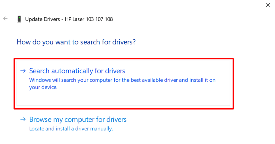 - Select **Search automatically for drivers** and wait for Windows to search for the best driver available for the printer. The process requires an internet connection, so ensure your PC is connected to a Wi-Fi or Ethernet network.