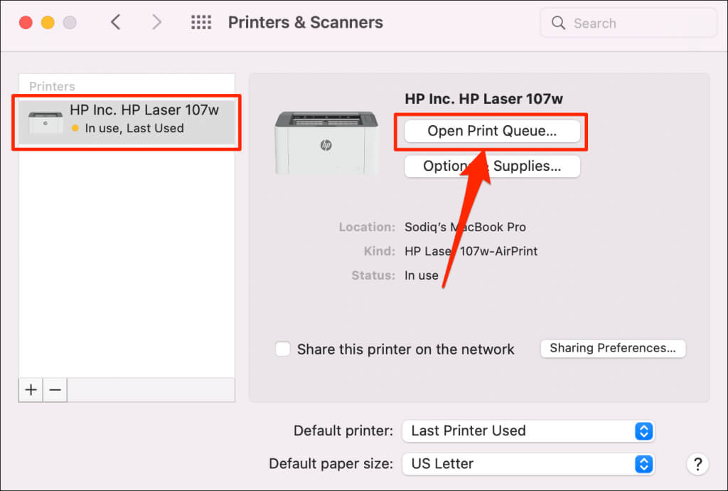 - Go to System Preferences > Printers & scanners, select the printer on the sidebar, and select Open Print Queue.