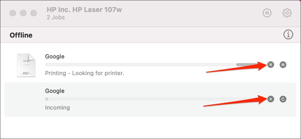 - Select the **x icon** next to the pending print jobs to remove them from the queue.