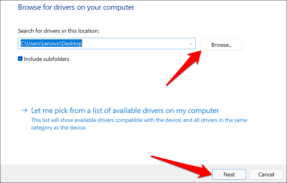 Alternatively, select Browser my computer for drivers to manually install a driver you downloaded from the printer manufacturer’s website. Afterward, choose Browse, navigate to the driver’s location on your PC, and select Next to install the update.