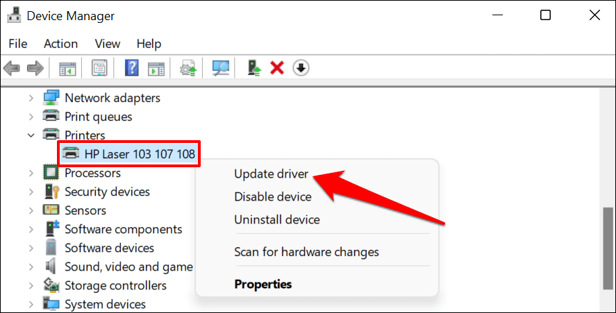 - Expand the “Printers” category, right-click the printer’s driver, and select **Update driver**.