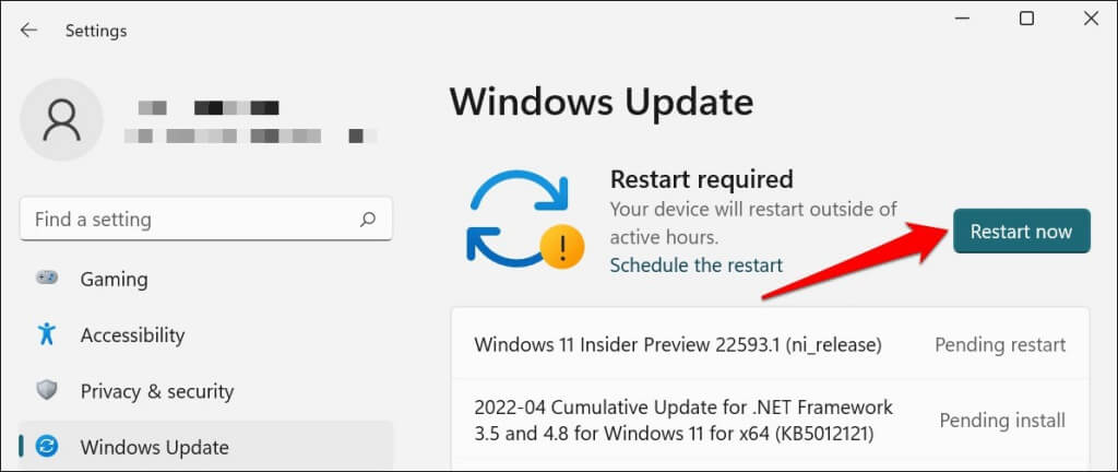 In Windows 11, go to Settings > Windows Update and wait for Windows to check for updates. You may need to restart your computer if Windows has already downloaded the update. Select Restart now to update and reboot your computer.