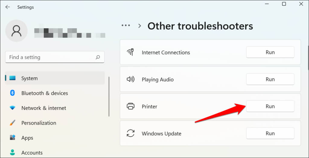 There’s another way to access the printer troubleshooter in Windows 11. Go to Settings > System > Troubleshoot > Other troubleshooters and select Run next to “Printer.”