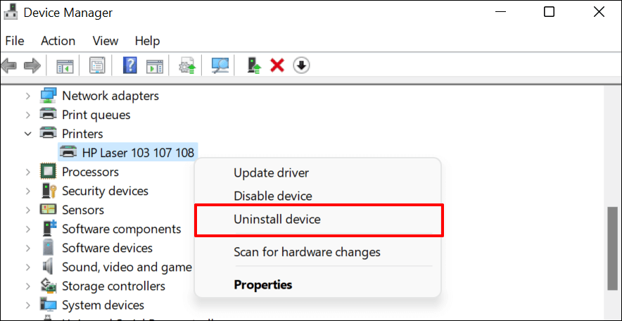 - Expand the “Printer” section, right-click the printer’s driver, select **Uninstall device**, and select Uninstall on the pop-up.