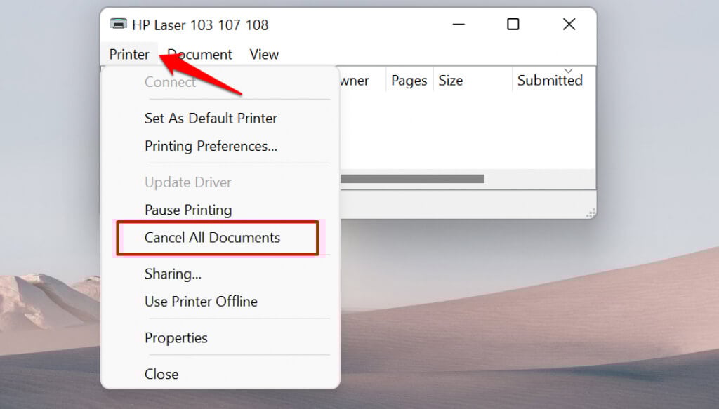 - Select **Printer** on the menu bar and select **Cancel All Documents**.