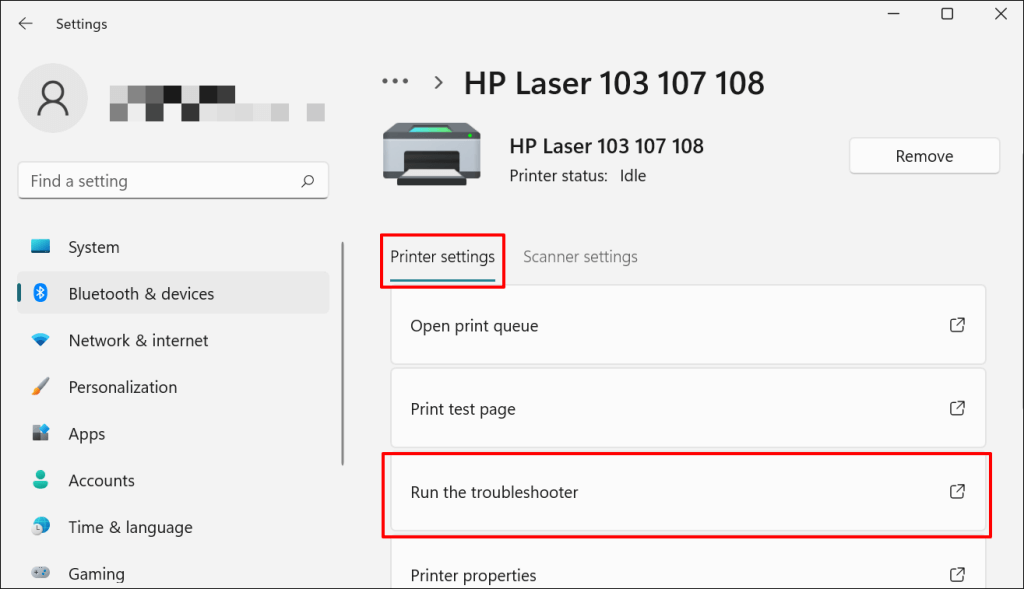 - Select **Run the troubleshooter** in the “Printer settings” tab.