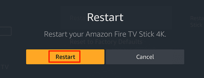 - Select **Restart** in the prompt that appears on your screen. Your Fire Stick will reboot.