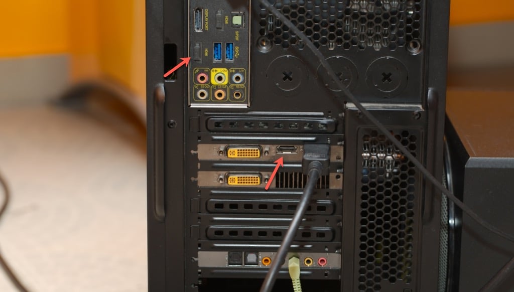 Many desktop computers have integrated graphics available through an HDMI port on the motherboard itself. If you have a discrete GPU installed, make sure to plug the HDMI cable into the card and not into the HDMI port on the motherboard. The picture above is an example of a motherboard connection. A discrete GPU will have the connector on the card itself, accessible through the tall rear slots on the back of the computer.