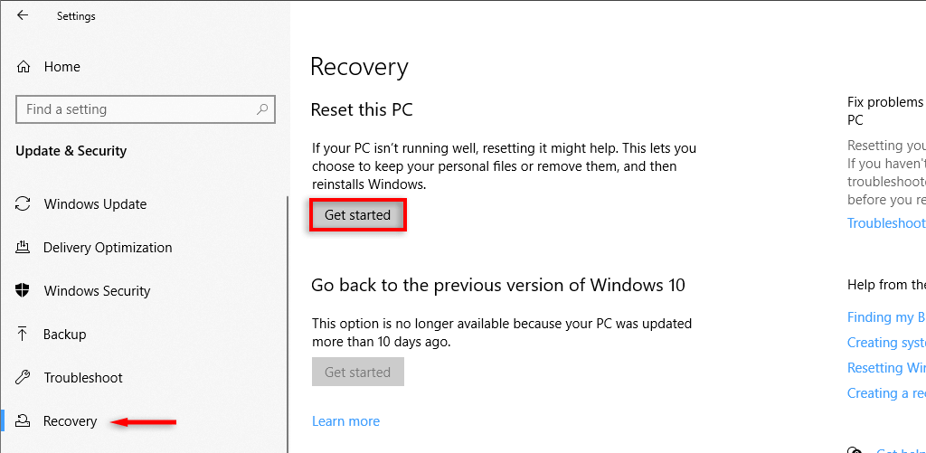 - Select Recovery from the left-hand menu.
