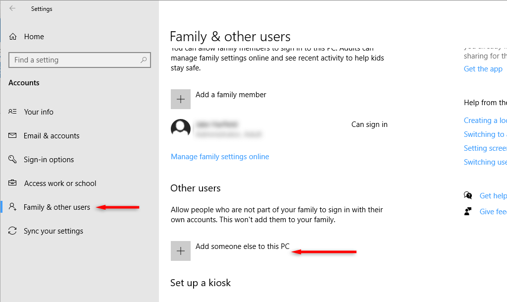 - Select Family & Other Users. * Select Add someone else to this PC.