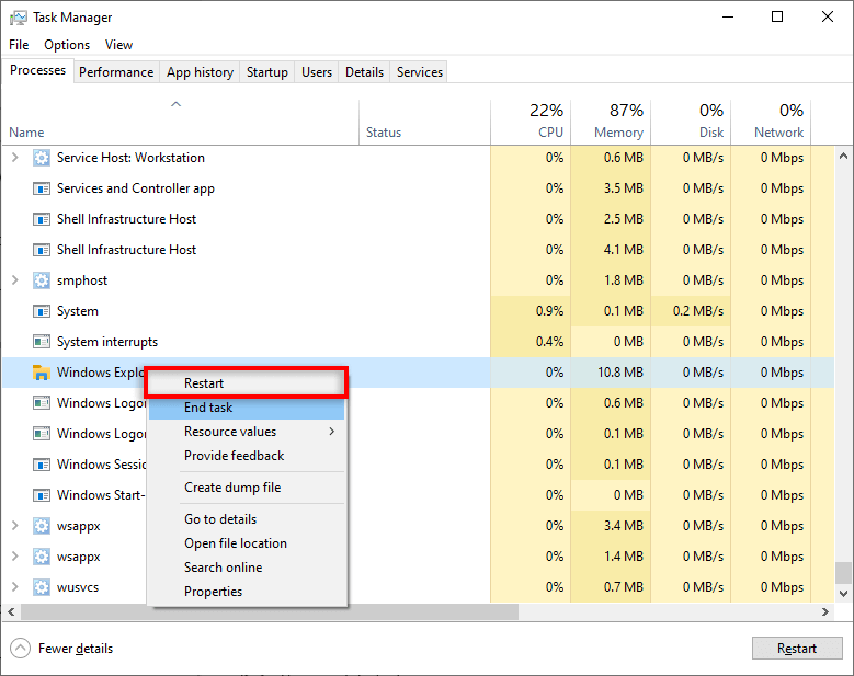 - Right-click the process and select Restart.