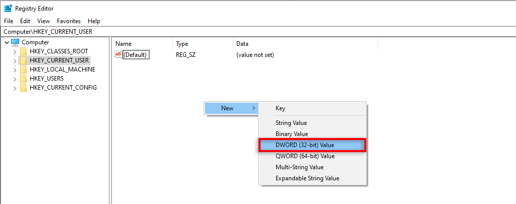 - Select HKEY_CURRENT_USER then right-click on the screen and select New > DWORD (32-bit)Value.