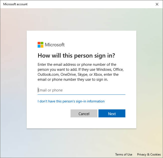 - Select I don’t have this person’s sign-in information.