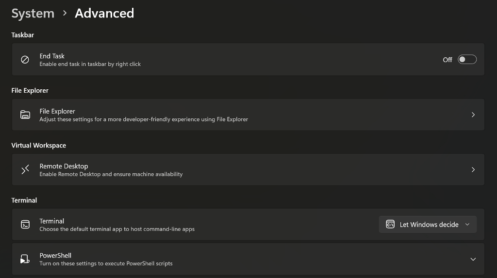 This is an updated version of the For Developers page. You can find it in Settings >** System **> Advanced. On this page, you can also fine-tune options for File Explorer, Virtual Workspace, Terminal, Dev Drive, and more.