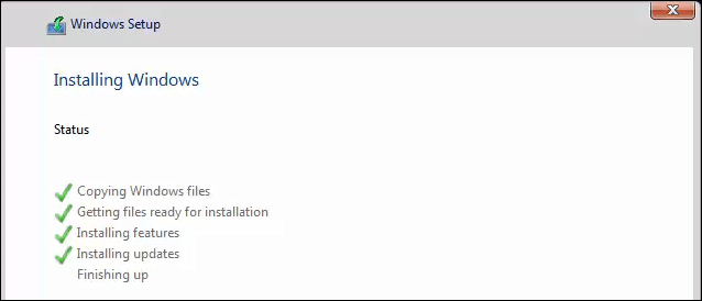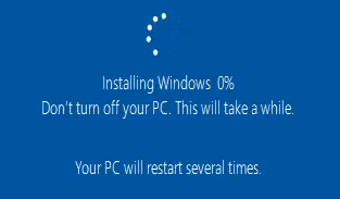 The installation will continue. First, you’ll see a screen like the one below for several minutes. Then your computer will restart, and you’ll see a black screen with a blue Windows icon. It will go through several stages not requiring any input from you.