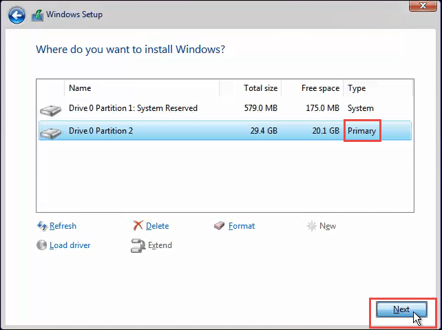 You may be asked where you would like to install Windows. Typically, it will be the Primary drive. Select that and click Next.