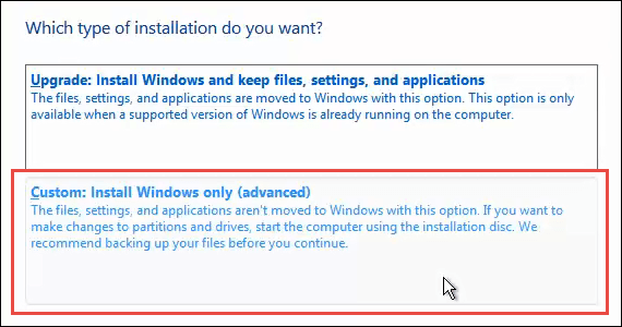 To do this in a way that wipes the drive, go until you get to the point where you’ll be asked, Which type of installation do you want? At this point choose Custom: Install Windows only (advanced).