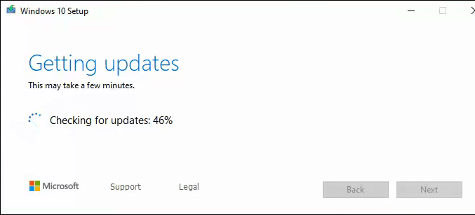 It may quickly go through a few more screens such as Choose what to keep, Making sure you’re ready to install, and then it will stay on Getting updates for several minutes counting the percentage done. This can take a while.