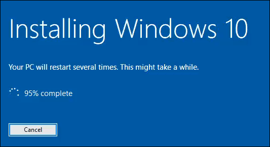 It will then quickly go through some of the screens like before, and then you’ll see the big blue Installing Windows 10 screen. It warns that your PC will restart several times and that it will take a while. After some time, your computer will restart.