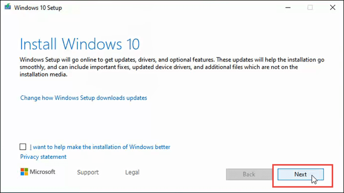 Next, the Windows 10 Setup window will open. It reads Install Windows 10 and that it will go online to get updates. If you wanted, you could click on Change how Windows Setup downloads updates. For our purposes, click on the Next button.