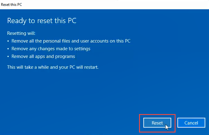 After a few seconds, you’ll see the Ready to reset this PC window. If you’re certain you want to do this, click on Reset.