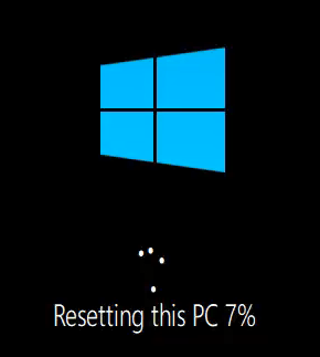 The Windows logo will come back and under it will read Resetting this PC. It will start to count in percentage of completion. This can take several minutes to an hour or more depending on your PC. When it is complete, you can begin your Windows set up again.