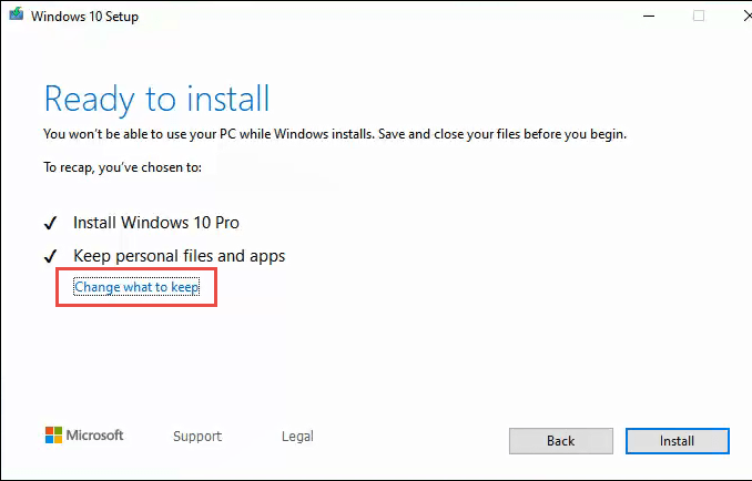 It will then start Making sure your PC has enough space, and then arrive at the Ready to install screen. It may say that it will Keep personal files and apps. Just click on Change what to keep under that.