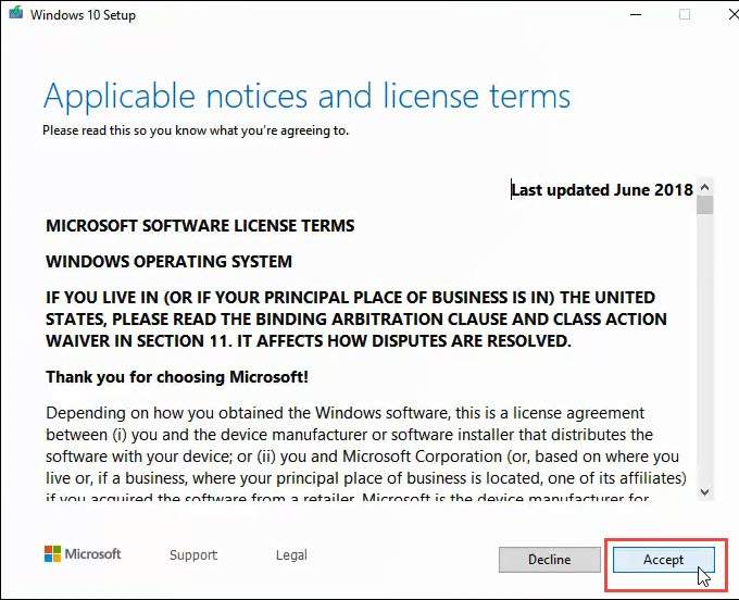 It may quickly go through a few screens, like Getting updates, Restarting Windows 10 Setup, Checking your PC,** We’re getting a few things ready**, and then stop on the **Applicable notices and license terms **screen. Feel free to read it and click on Accept.
