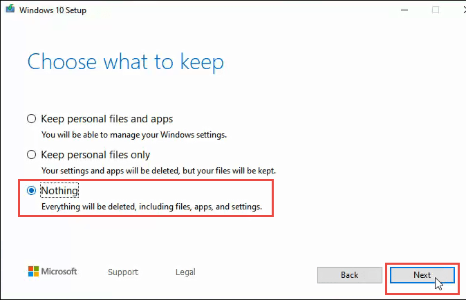 There will be three choices: Keep personal files and apps, Keep personal files only, and Nothing. If you want a clean wipe, click on Nothing then click Next.