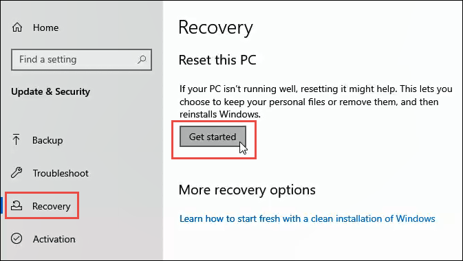 In the Update & Settings window, on the left-side, click on Recovery. Once it’s in the Recovery window, click on the Get Started button.