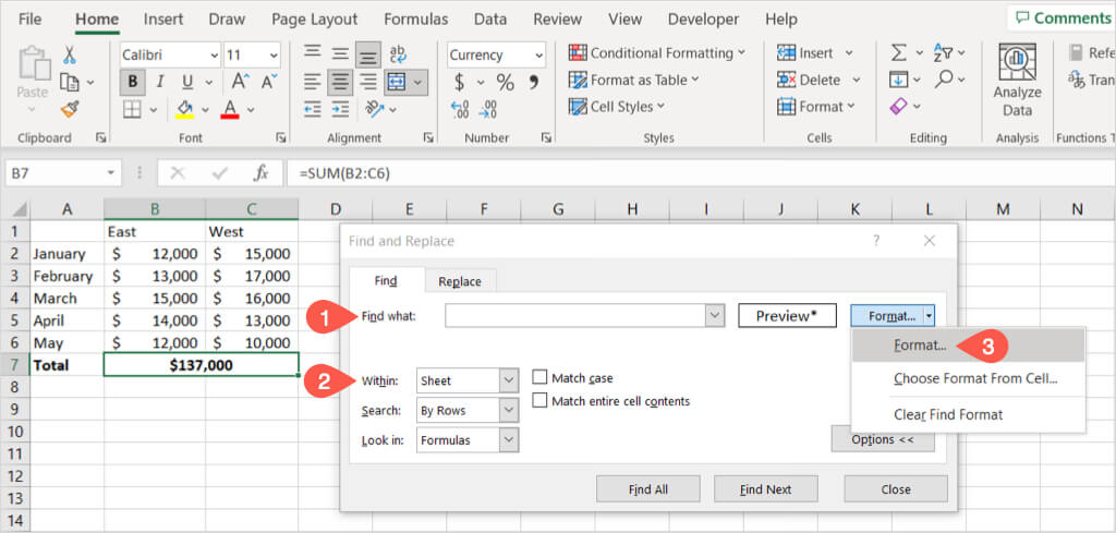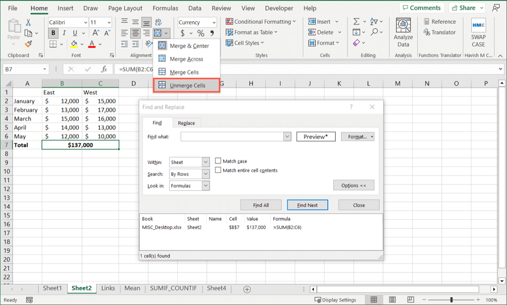 If you have numerous merged cells in your sheet that you want to unmerge, you can use the Find tool to locate the cells and then unmerge them. The tool you need to locate merged cells is currently only available on Windows.