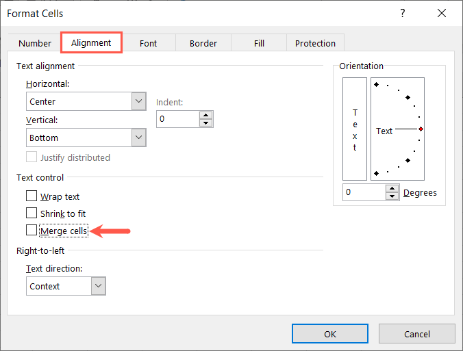 - Format: Select Format, go to the Alignment tab, and check the box for Merge cells near the bottom. Select OK.