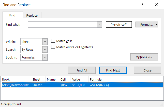 - You’ll then see the results expand at the bottom for all merged cells in the sheet or workbook. Pick one of the results to view the cell(s).