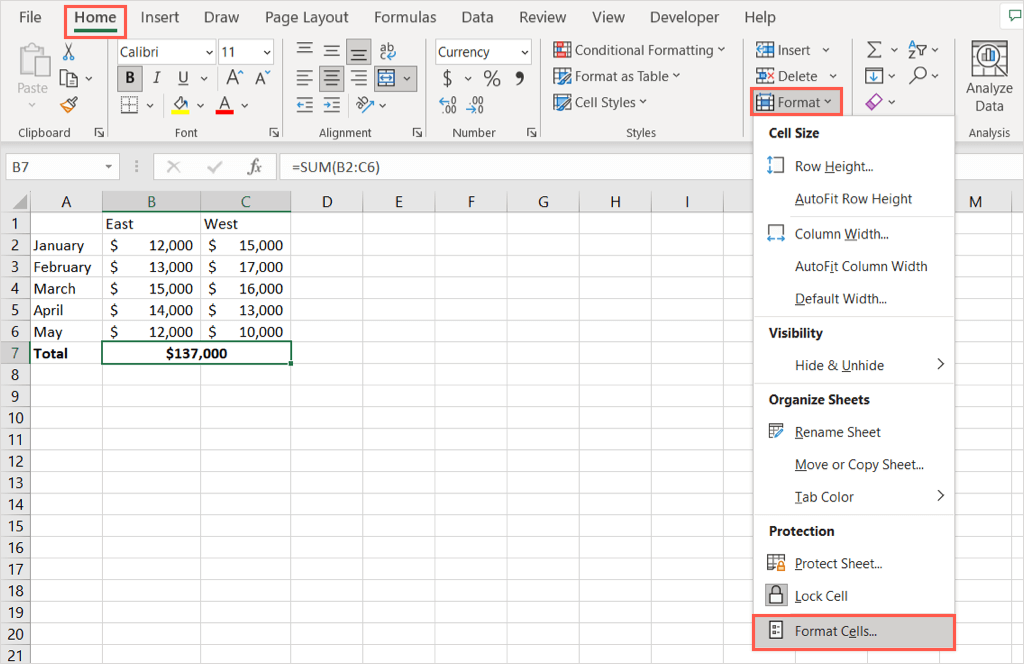 - To open the tool either right-click and pick Format Cells or select Format > Format Cells in the Cells section of the ribbon on the Home tab.