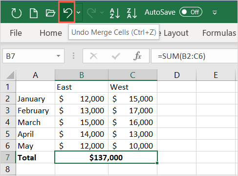 If you merge cells and immediately realize it was a mistake, you can reverse the action using the Undo feature or a keyboard shortcut in Excel. These options only work when merging cells was the last action you took.