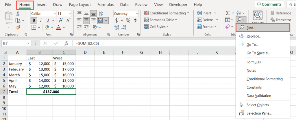 - Go to the Home tab and pick Find & Select > Find in the Editing section of the ribbon.