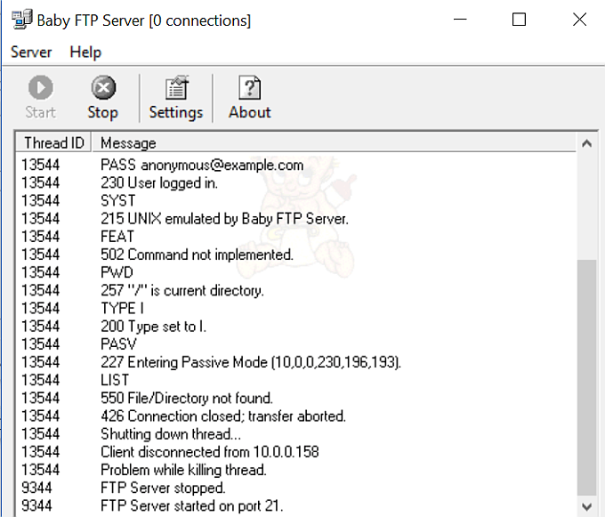 Once you start the BabyFTP server, you should see “FTP Server started on port 21” if everything is working properly.