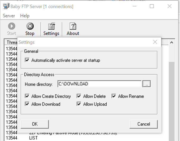 With BabyFTP, you simply install the application and it’ll launch a simple anonymous FTP server on the originating computer. In Settings, you can configure the folder to transfer files from and to, and what actions you want to allow like adding or removing directories and files, and whether those can be modified by the remote client.