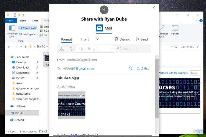 Another way to transfer files between computers, not only over your local network but over the internet, is sharing by email.