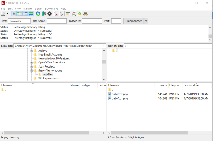 Now, on the other computer, you can use any FTP client, like FileZilla, to open a connection to that remote computer using it’s IP address and port 21.