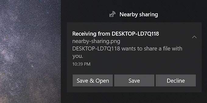 When you select that remote computer system, a notification will appear on the other computer that there’s an incoming file.