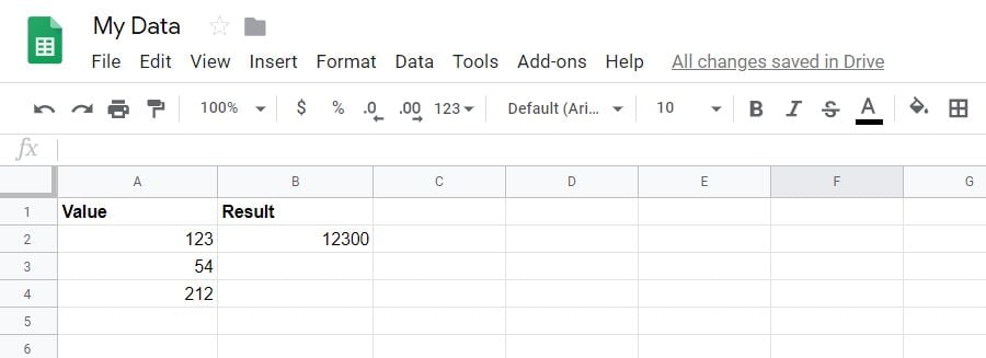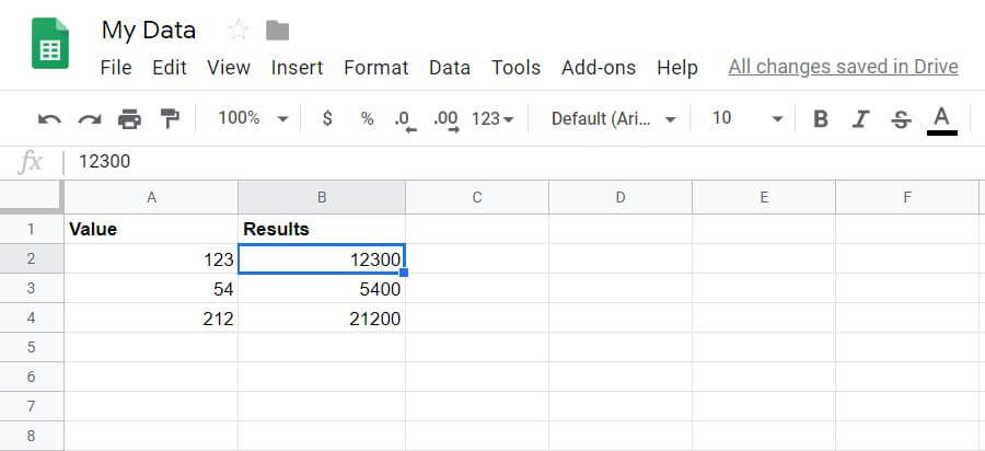 In our example spreadsheet, you can perform calculations on the three rows of data as follows. for (var i = 1; i <data.length; i++) { var result = data[i][0] * 100; sheet.getRange(i+1, 2).setValue(result); } }