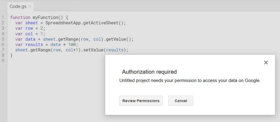 The first time you run a new Google Sheets script function like this (by selecting the run icon), you’ll need to provide Authorization for the script to run on your Google Account.